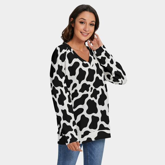 Cow Print Sweater Cow spot All-Over Print Women's V-neck Imitation Knitted Sweater With Long Sleeve
